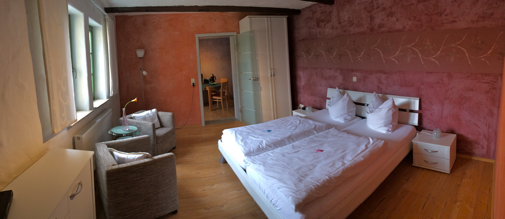 Wasserkocher uvam. - Schlafraum mit Doppelbett, Kleiderschrank, Kommode, Fernseher, Radiowecker, 2 Sessel mit Glastischchen