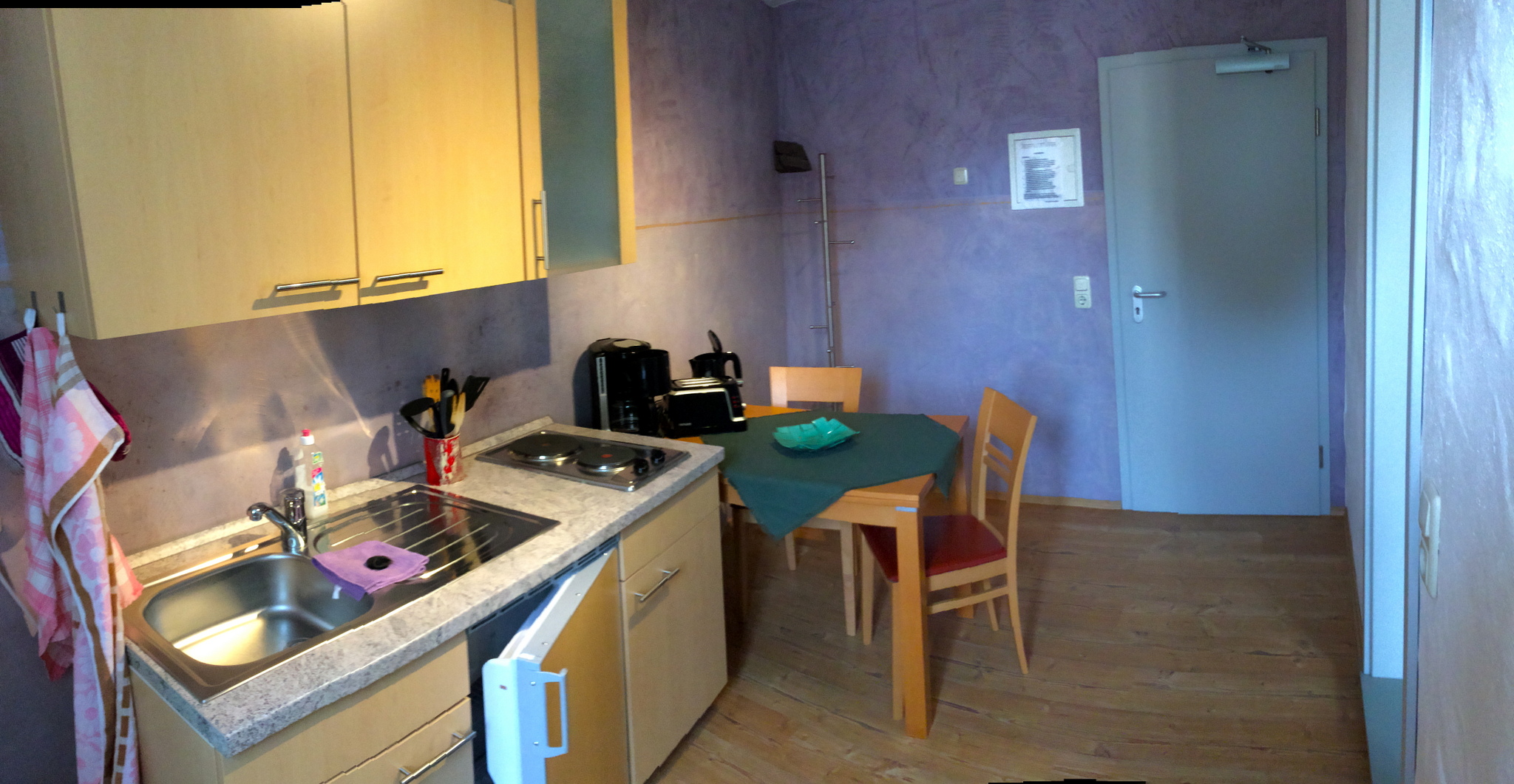- Küche mit Küchenzeile und Esstisch, Kühlschrank mit Gefrierfach, 2 Kochplatten, Kaffeemaschine, Toaster,