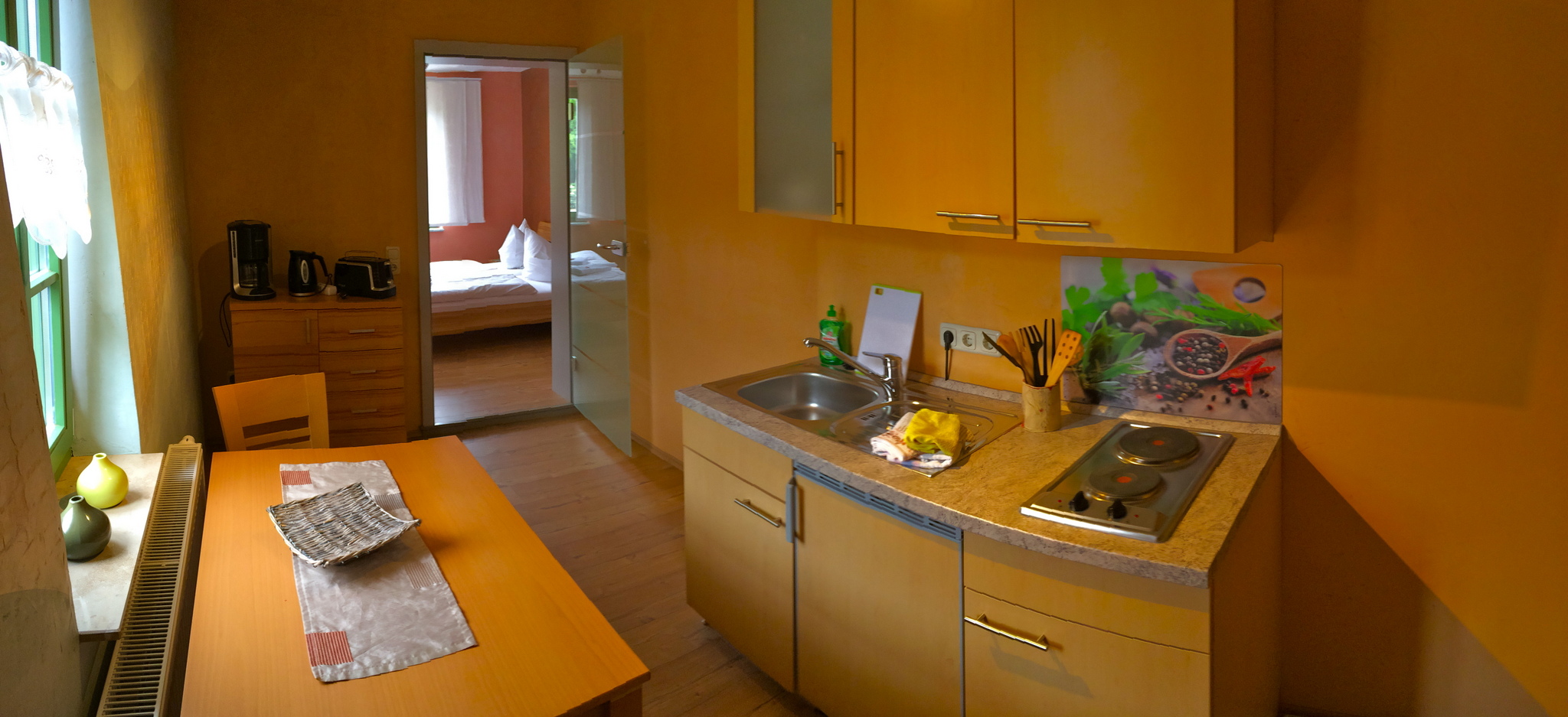 - Küche mit Küchenzeile und Esstisch, Kühlschrank mit Gefrierfach, 2 Kochplatten, Kaffeemaschine,
